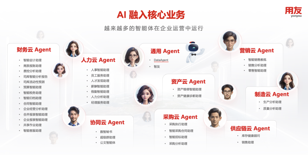 除了通用智能体之外,用友BIP还将AI与业务场景深度融合,在财务、人力、供应链、采购、制造、营销、研发、项目、资产、协同十大领域中融入40多个智能体,包括:财务领域的智能会计助理、商旅报账助理、共享作业助理、智能税务助理、司库智能分析、企业经营分析助理等;人力领域的人事智能助理、员工服务助理、人才发现助理、薪酬智能助理、人力分析助理等;覆盖整个供应链条的智能销售教练、零售智能助理、库存健康顾问、采购智能助理、生产计划助理、质量分析助理、资产维修智能助理等;以及协同领域的数智秘书、超级群助理等。
