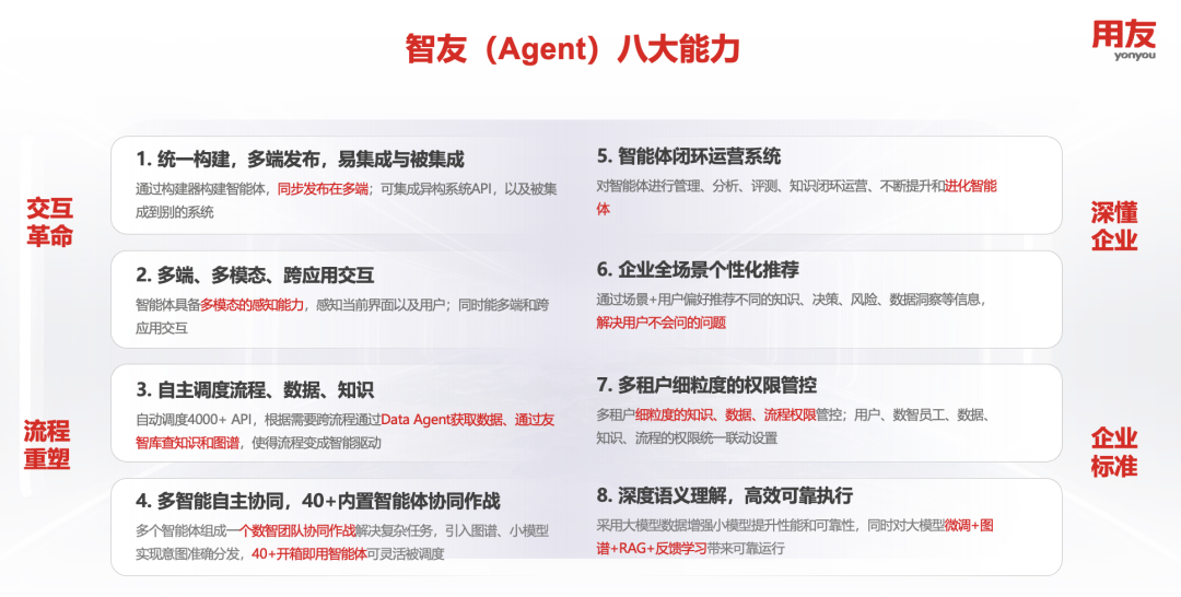 作为深懂企业的智能体,此次全面升级的智友具备“数据、知识、流程”与AI深度融合的核心能力,在交互革命、流程重塑、深懂企业、企业标准四个方面带来八大核心能力: