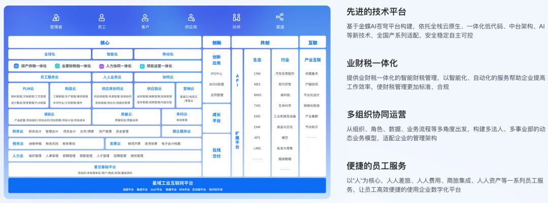 金蝶云·星辰现已升级为金蝶AI星辰用,基于金蝶AI苍穹云原生PaaS平台构建,聚焦小型企业在线经营和数字化管理,提供财务云、税务云、进销存云、零售云、订货商城等SaaS服务,支持企业拓客开源、智能管理、实时决策; 金蝶AI星辰还提供轻量级PaaS平台和全面的API接口,广泛连接生态伙伴,为小微企业提供一站式服务,助力企业快速成长。