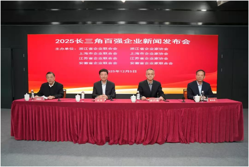 12月5日,上海市企业联合会、上海市企业家协会、江苏省企业联合会、江苏省企业家协会、浙江省企业联合会、浙江省企业家协会、安徽省企业联合会和安徽省企业家联合会在上海中国金融信息中心召开2025长三角百强企业新闻发布会。浙江省企业联合会领导主持会议,长三角三省一市企联领导和中央在沪媒体、上海主流媒体记者参加了会议。