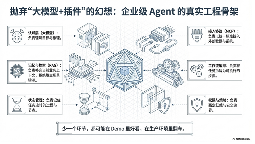 所以,企业级Agent真正的骨架,不是“大模型+插件”这么简单,而是: