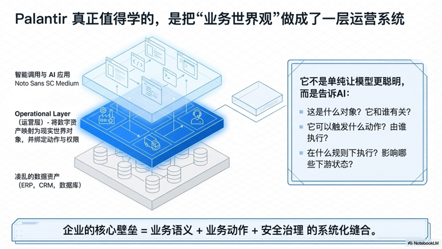 Palantir真正值得学的地方,不是单纯让模型更聪明,而是把企业运营需要的那套“业务世界观”做成了一层可以计算、可以调用、可以治理的系统。