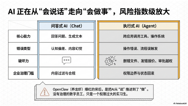 但很多人不愿承认的一点是:从“问答式AI”升级到“执行式AI”,不是风险变小了,而是风险被放大了。