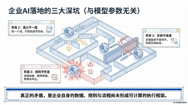 三大坑不填平,企业AI就很容易变成一个昂贵的演示工程:看起来先进,用起来全靠补丁,出了问题谁都说不清,到底是模型错了,还是业务根本没定义明白。