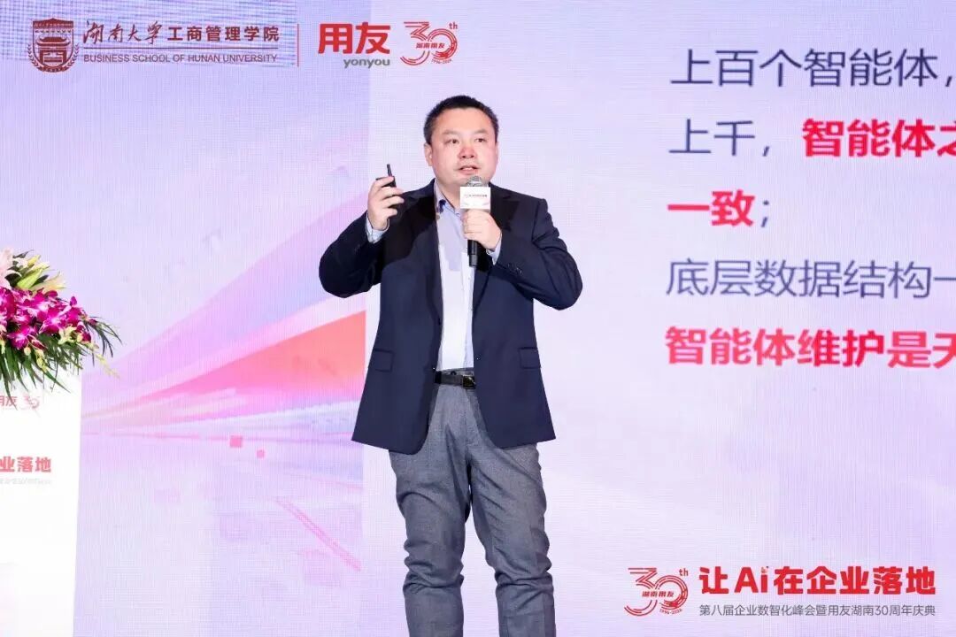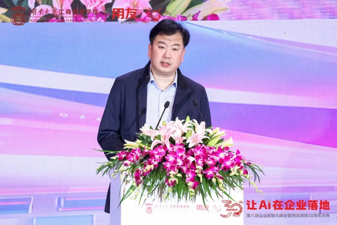 本次论坛得到了湖南省工信厅领导的高度重视和指导,湖南省工业和信息化厅党组成员、副厅长陈晖作为特约嘉宾出席并作指示。他表示,当前,湖南正深入贯彻落实国家人工智能发展战略,通过开展“智赋万企”行动,在算力建设、企业培育及典型场景打造上取得显著成效,目前已拥有超400家人工智能企业,总算力超13000PF。面对当前存在的痛点,他强调下阶段将纵深推进“人工智能+”行动,聚焦重点企业培育、创新平台打造、示范场景推广、未来场景引领及生态体系构建五大方向。陈晖还高度肯定了用友与湖南大学连续八年举办峰会的意义,期待各界深化交流,共同探寻企业数智化转型路径,为打造国家先进制造业高地贡献力量。