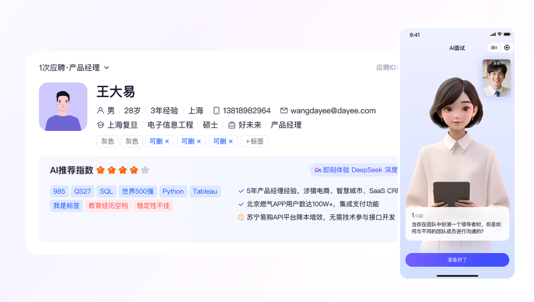 人才与企业故事的起点往往源于招聘,而在招聘环节,企业常常面临海量简历筛选和人才评估欠准的难题。用友HR SaaS中的智能招聘助理不仅能够基于岗位模型完成简历的智能筛选与排序,更能以AI面试官的身份对人才开展标准化初轮评估,并为后续的人工面试提供过程记录与专业建议,让人才引进的精准度与效率均得到提升。
