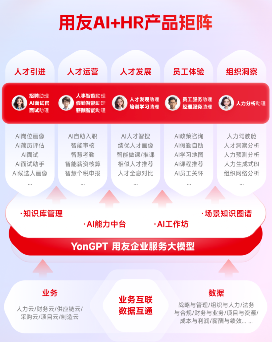 “流程、数据、AI”为用友HR SaaS深度融合AI技术提供了前提,在具体场景的落地上,用友HR SaaS构建起了一套完整的AI+HR产品矩阵,涵盖人才引进、人才运营、人才发展、员工体验、组织洞察等核心模块,并借助9大智能助理,实现AI与HR的全场景智能联动。