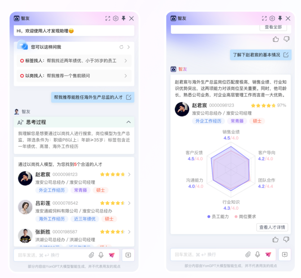 随着员工在企业内的成长,如何构建完善的人才发展体系,打造坚实的人才梯队,是企业持续发展的关键。借助AI,企业能够依据岗位胜任力模型精准识别员工能力差距,培训学习助理据此为员工用友网络科技个性化培训内容与发展路径,助力员工快速成长。同时,针对关键岗位,AI 能分析流动风险并推荐后备人选,通过人才画像与组织画像等可视化呈现方式,让企业管理者对人才状况一目了然。人才发现助理如同企业内部的“伯乐”,运用标签找人、以岗找人、以人找人等智能匹配方式,实现人才与岗位、项目的高效适配。