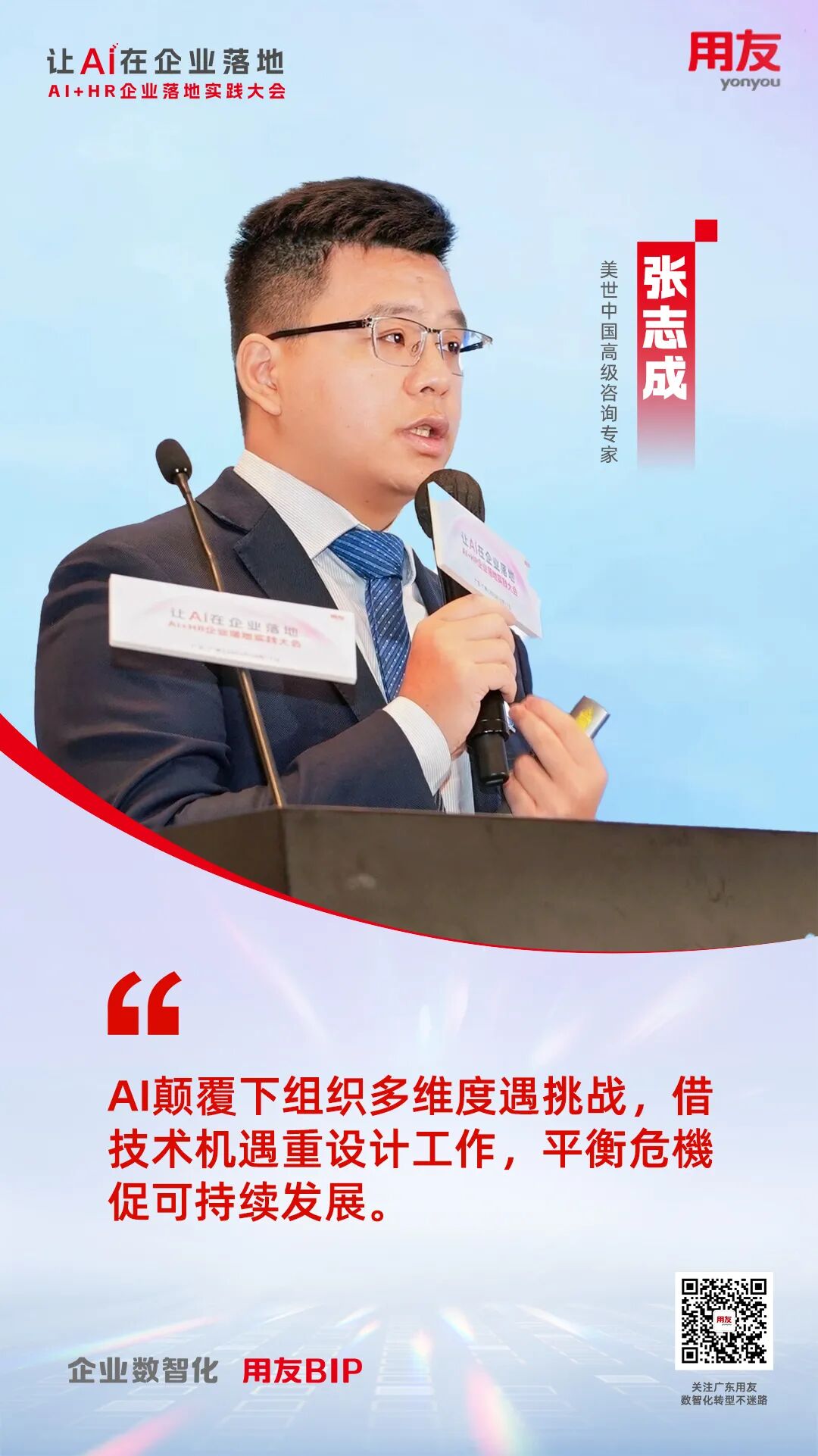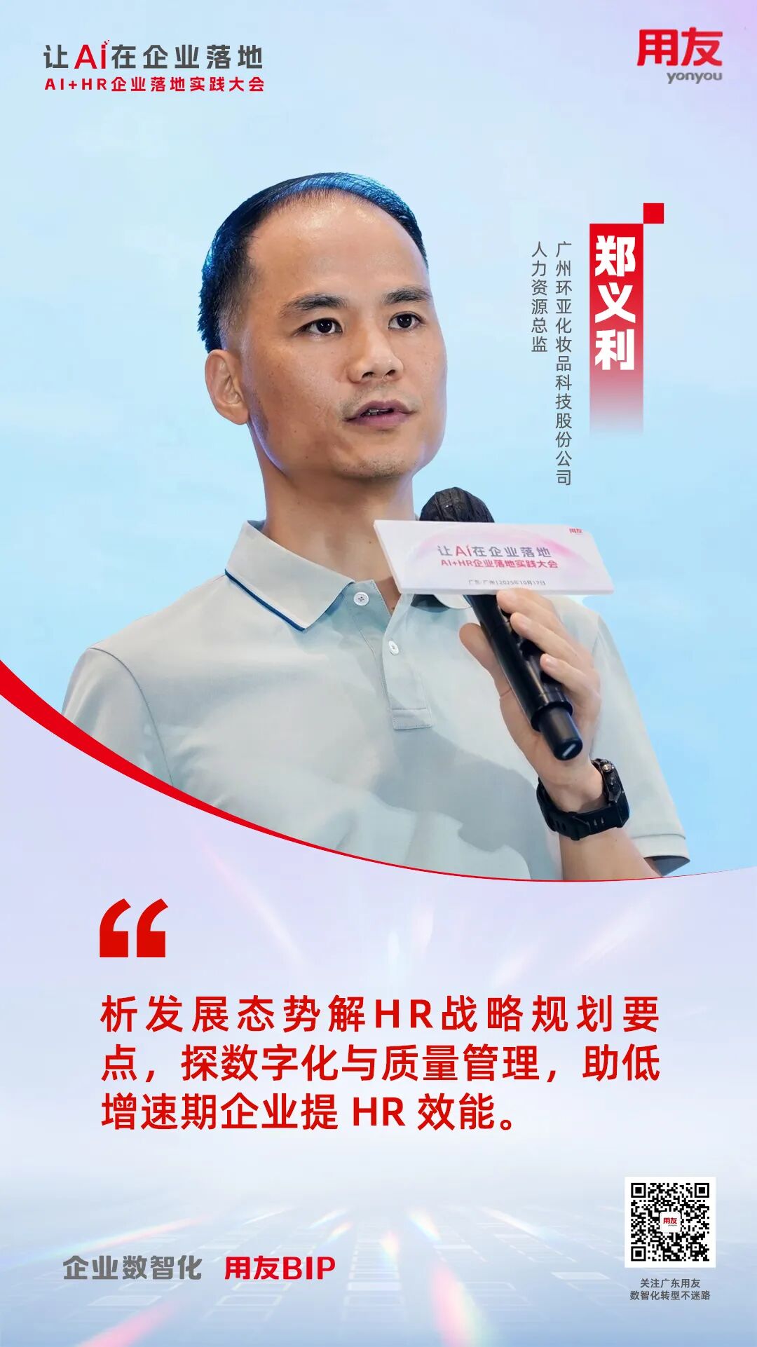美世(Mercer)是全球知名的人力资源、健康福利及投资咨询机构,致力于帮助客户实现人才、退休及投资等领域的战略目标。通过数据驱动的洞察与数字化工具,美世协助客户吸引、保留并激励关键人才,打造敏捷高效的组织架构,支撑企业在复杂多变的市场环境中持续成长与转型。美世中国高级咨询专家张志成先生带来了美世最新的调研和研究成果,在组织了全球范围内数百家领先企业的调研和访谈之后,提炼总结了AI工具的普及对企业的组织层面、人才层面、文化层面以及业务等层面的冲击和影响;张志成先生还分享了领先组织面对AI冲击化危为安的优秀实践案例,引发大家的思考。广州天赐高新材料股份有限公司主营业务为锂离子电池材料、日化材料和特种化学品两大板块,基于强大的基础化学能力和工艺积累,形成了以电解液原材料为主的一体化布局战略。公司生产的日化材料产品应用于各类个人护理品、日常家居用品中,为领域提供创新的解决方案。广州天赐高新材料有限公司人力资源部长李水凤女士的HR数字化转型落地实践,为企业人力数字化升级提供参考。其转型之旅聚焦四大核心:先从角色转型思考明确目标,锚定HR从事务型向战略型转变方向;再以数字化技术为抓手,通过系统搭建与流程优化助力 HR转型实施;同步展示HR数字化平台成果,直观呈现效率提升与管理优化实效;最终通过业务共振打造差异化实践,实现人力管理与业务发展深度协同。此次分享全面拆解转型路径,为同行业推进 HR 数字化转型提供了可借鉴的实战经验。卓越教育是AI+招聘领域的领先者,构建AI全闭环智能体验,推动教育类人才高质量就业,打造了全国首个聚焦中小学教师岗位的公益AI招聘平台,以AI技术重构教育人才求职闭环(简历诊断→模拟面试→岗位匹配),解决教育行业校招“供需错位”痛点。融合大模型+Qwen3+DeepSeek,实现智能解析+语义推荐+模拟面试闭环。卓越教育集团招聘总监韩宁女士在内容提到AI招聘的整体规划与布局思路,明确技术应用的核心方向;随后呈现求职小助手全景图,详细展示其简历解析、模拟面试、职业测评三大核心功能,直观体现AI对招聘效率的提升作用。此外,还深入探讨AI招聘工具的落地路径与未来拓展方向,为企业优化招聘流程、求职者提升求职效率提供切实参考,推动AI与招聘场景的深度融合。广东环亚化妆品科技股份有限公司凭借35年坚守积累品牌力与科技力,构建多品牌、多品类、全球化矩阵。环亚HR历经五个发展阶段,从家庭化运作迈向“使命愿景坚守者”等新定位,未来将减少事务处理、强化战略与解决方案输出。广州环亚化妆品科技股份公司人力资源总监郑义利先生分享针对当前发展态势,重点解读 HR 战略规划的制定要点,助力企业锚定人力方向;同时深入探讨HR流程数字化路径与质量管理方法,以技术赋能优化人力运营。内容为企业在低增速阶段提升HR效能、支撑业务稳定发展提供实用指引。中国企业全球布局持续深化,行业覆盖制造、科技、服务等领域,但在跨文化管理、合规风控、人才适配等方面面临挑战,制约出海进程。