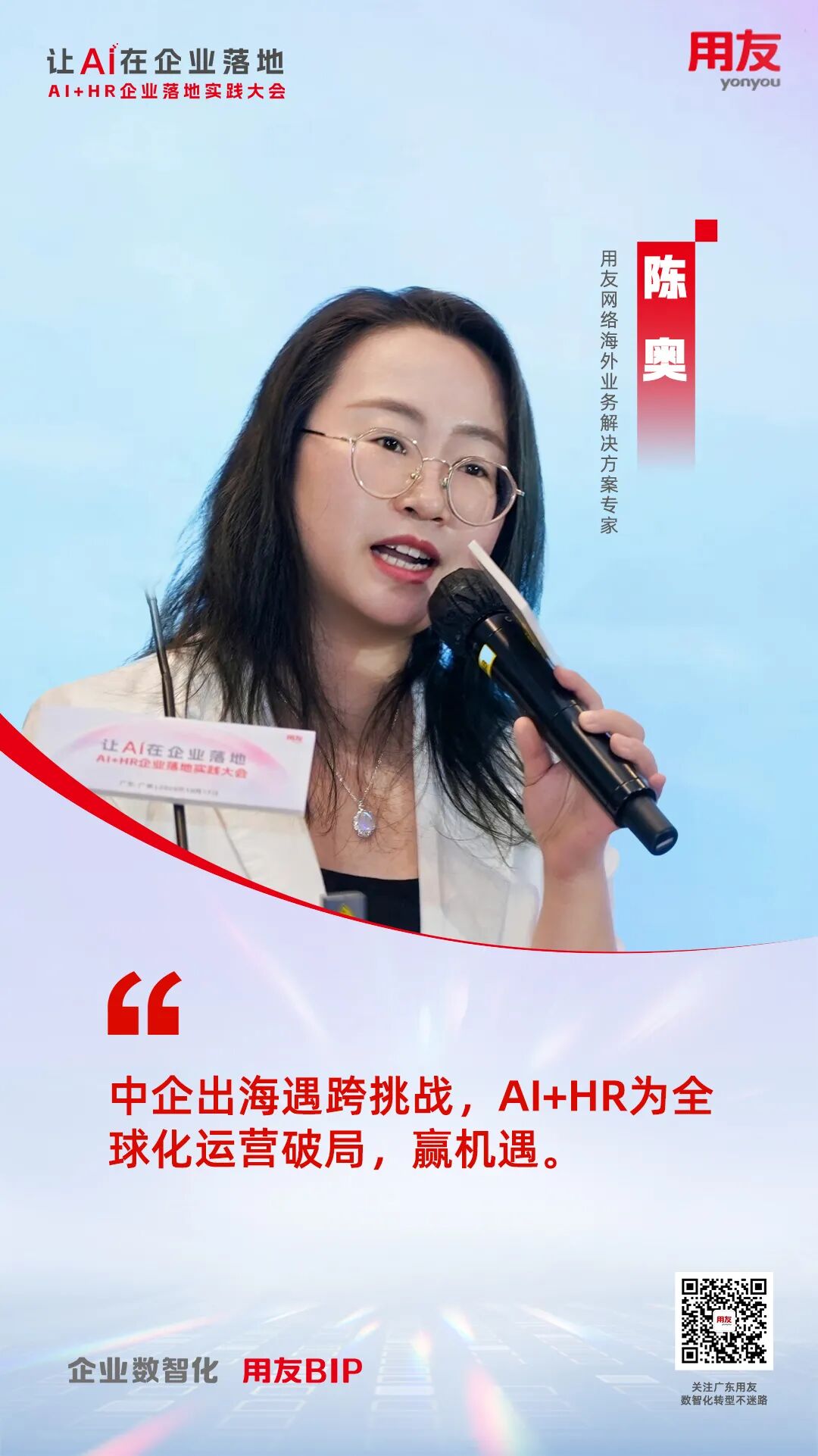 在上述背景下,“AI+HR” 成为中企出海运营的新机遇与破局之道。用友网络海外业务解决方案专家陈奥在分享中以 “智驭风浪,启航四海助力粤港澳企业全球化发展” 为主题,深入解析中企全球布局现状与挑战,挖掘 AI+HR 在出海场景的实战价值。他指出,通过智能招聘匹配全球人才、跨区域薪酬合规管理、多语言员工培训赋能等落地应用,AI+HR 可有效化解出海人力管理痛点,为中企突破运营瓶颈、实现全球化稳健发展提供有力支撑。会后,与会嘉宾对用友HR SaaS展开了浓厚的兴趣,纷纷围绕系统功能与企业实际需求的适配性展开深度交流。不少来自制造、教育、日化等行业的嘉宾,结合自身HR管理痛点,重点咨询了系统在多场景下的落地能力。