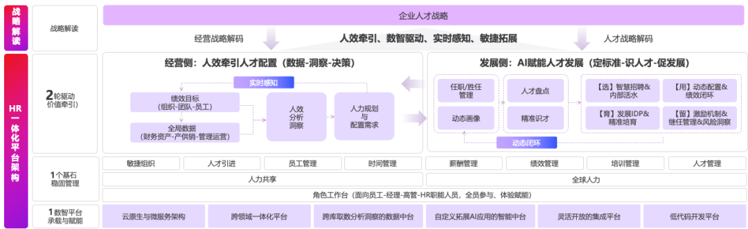 支撑这一体系的,是 “2+1+1” 的产品体系:“2” 即前述双轮驱动(经营侧从战略解码向人才驱动,发展侧通过数智化人才管理向经营驱动);第一个 “1” 是稳固基石 ——用友 30 多年来在人力资源数字化建设中的积累,能够全流程打通核心人事、招聘、培训、绩效、发展等全领域模块,并支持人力共享、全球人力等多元化场景延伸;第二个 “1” 是核心竞争力 —— 数字平台群,包括跨领域一体化平台、跨库取数的数据分析中台、支持企业自定义 AI 能力与智能体的智能中台,以及灵活开放的集成平台、低代码开发平台等。通过这一产品体系,实现人力资源管理 “洞察 - 赋能 - 管控 - 提效” 四位一体的业人融合发展。