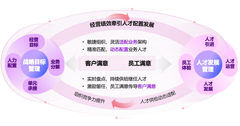 所谓业人融合,是一套以公司战略和业务增长为核心的人力资源管理体系,通过将人才管理的所有活动深度嵌入业务流程和价值链,实现人力资源与业务的战略同频共振。这一体系以 “双轮驱动” 为牵引:一方面,从战略目标管理维度,通过经营绩效牵引完善人才配置与发展;另一方面,从发展侧,通过打造动态人才供应链,有效评估人才的能力、绩效与发展潜力,进而持续提升组织整体能力,最终推动企业绩效的达成。在此过程中,员工获得成长、价值最大化发挥,员工满意带动客户满意,业务与公司的成功反过来成就员工个人,形成良性循环。