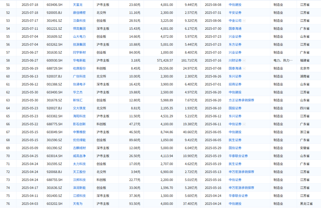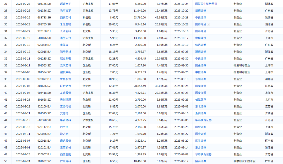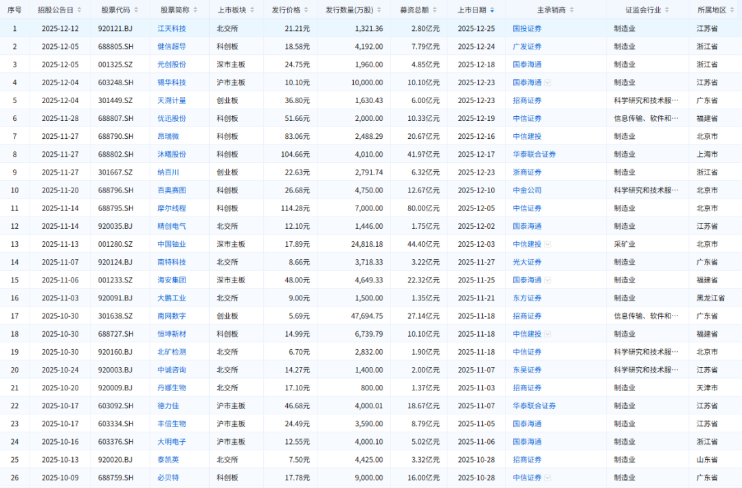 从上市日期来看,年末上市步伐加快,近两个月IPO上市公司均超10家。而从上市企业来看,江苏和广东的公司数量依旧领跑全国。募集总额超100亿公司有1家,详细IPO企业一览: